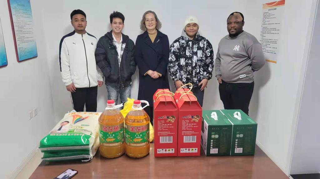2022年1月24日下午,徐雅娜副校长、外事处孙志强处长来到我校外籍教师、来华留学生公寓,给居留在校内的外籍师生送来了慰问品和疫情防护用品,代表学校向外籍师生们送去新春祝福。