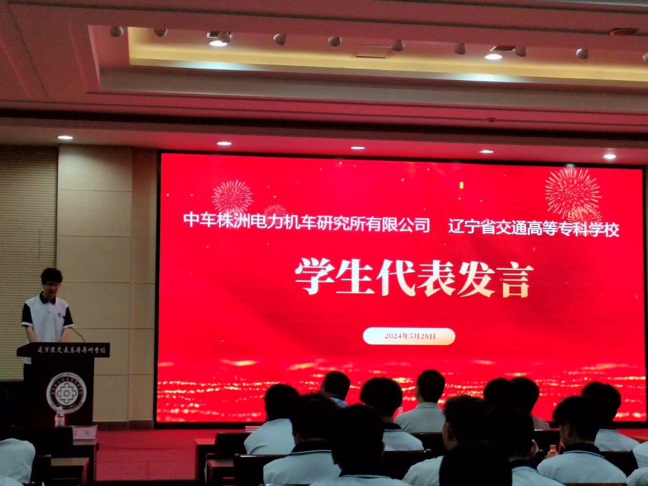 仪式开始,边境副书记宣读中车株洲电力机车研究所订单班校企合作协议,并公布了订单班学生名单。随后慕威书记与中车株洲电力机车研究所人事专员张天翔现场进行签约和授牌仪式。签约仪式后,由学生代表2022级城市轨道车辆应用技术专业周龙腾进行发言,表达了今后继续刻苦钻研学习专业知识,提升自己的实际动手操作能力,为能早日成为中车株洲电力机车研究所的合格员工打下坚实的基础。紧接着,中车株洲电力机车研究所有限公司企业代表张天翔发言,表示企业旨在打造“科技引领、行业一流、高端、高效、高质量”的国际化产业集团,是我国装备制造高端化、智能化、绿色化发展的重要力量。也对交专轨道系学子寄予了深厚的期望,希望能够吸引更多优秀的人才,为学校为企业的发展作出重要的贡献。