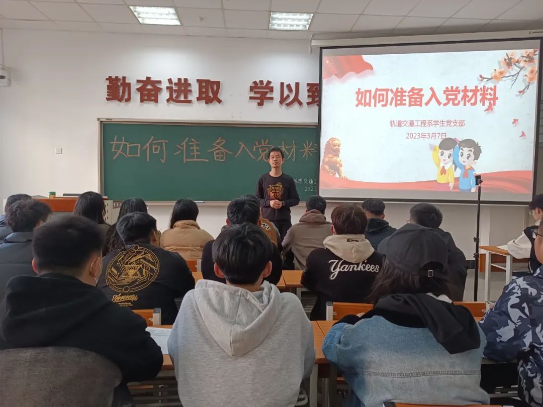 轨道交通工程系于2023年3月7日下午在C104举办了主题为“如何准备入党材料(一)”的专题党课。本次党课由轨道交通工程系专职组织员孔繁军主讲,2021级全体入党积极分子、2022级已经递交和准备递交《入党申请书》的同学参加。