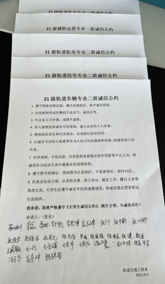 为提高学生诚信意识,培养学生诚信品质,轨道系积极开展诚信教育主题活动,各专业通过开展“班级诚信公约”签名活动,推动学风建设,助力诚信校园建设。