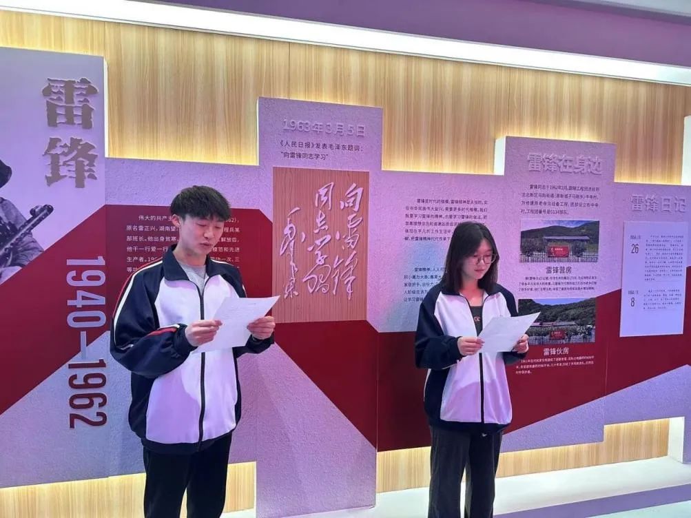 到达实践中心后,同学们观看了雷锋简介以及雷锋相关事迹的展览板。在讲解员的带领下,同学们重点参观了党群活动多功能厅、志愿服务沉浸体验厅等弘扬雷锋精神的展区,了解到雷锋精神和志愿服务的价值。学生代表卢科元和于美萍宣读雷锋日记,感悟雷锋不屈不挠的“钉子”精神。