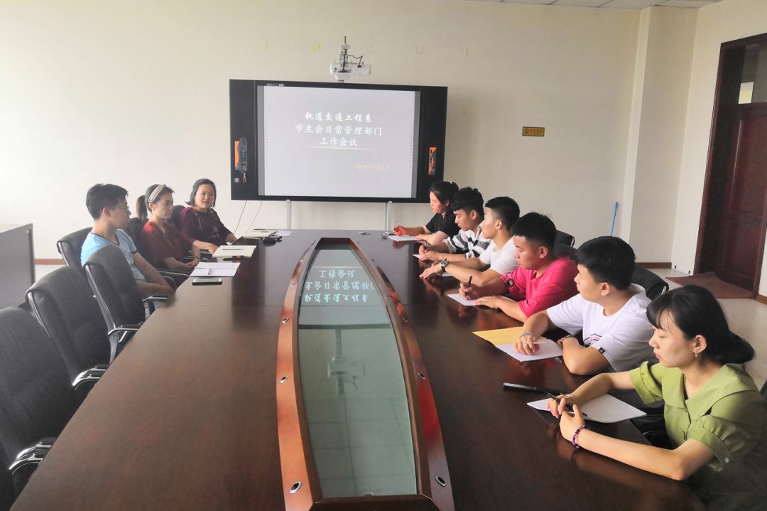 我系于7月2日下午在A座712召开轨道交通工程系学生会日常管理部门工作会议,参与此次会议的有轨道系党总支副书记兼学工办主任李爽、轨道系团总支书记杨丽、车辆专业辅导员孙龙、学生会主席团以及学生会日常管理部门各部长。