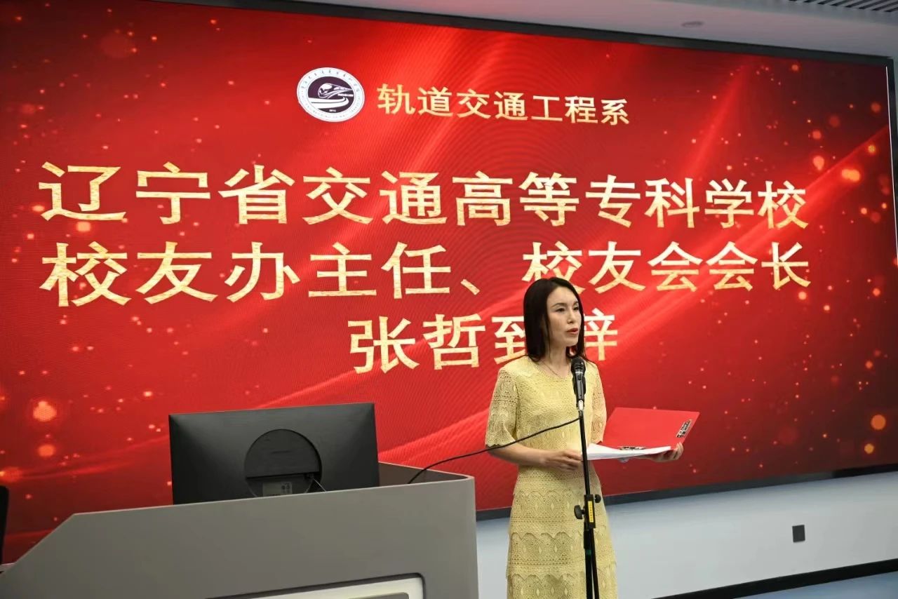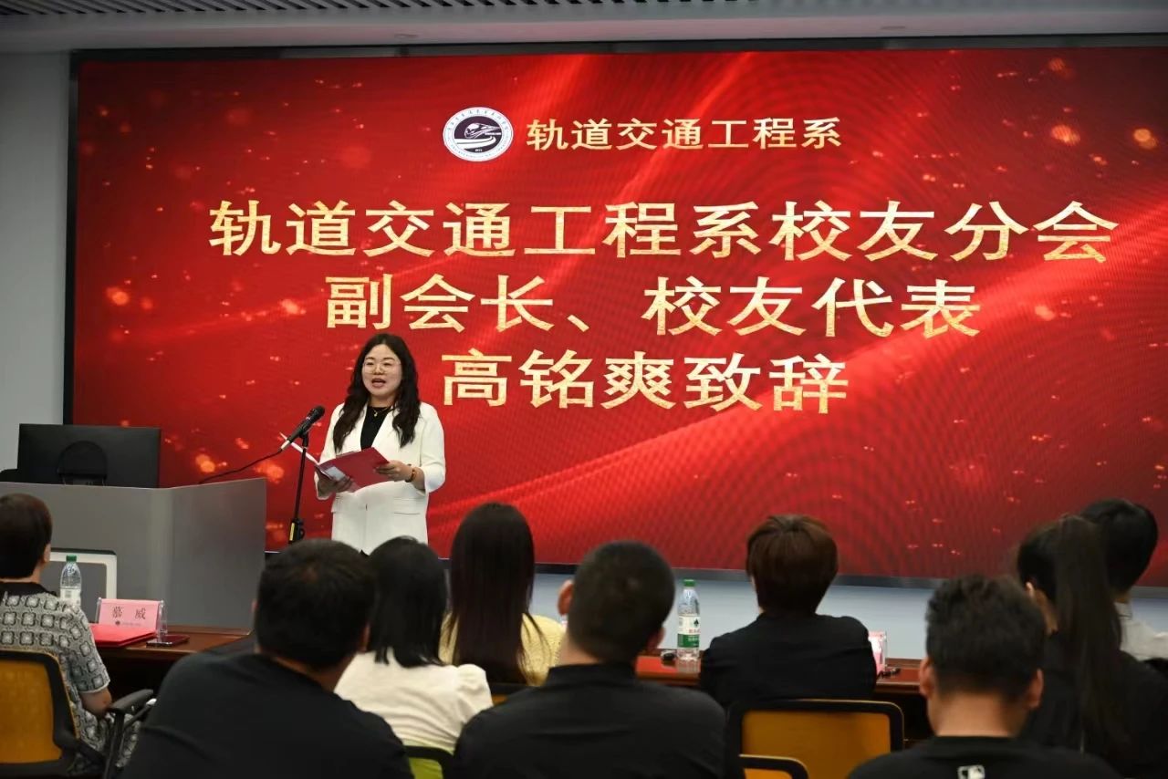 轨道交通工程系校友分会副会长,轨道交通工程系城市轨道交通运营管理2011届毕业生高铭爽致辞。她分享了个人的在校经历,感恩母校的教育与培养。随后,她发表了热情洋溢的讲话,回顾了学校的发展变化和自己取得的成绩,对轨道交通工程系校友分会新的工作给予了期望,她表示自己会发挥余光余热并关注和支持校友会的工作。为轨道交通工程系校友分会的成长增添一份色彩,为母校的发展添砖加瓦。最后她祝福母校百尺竿头、再接再厉,更上层楼!