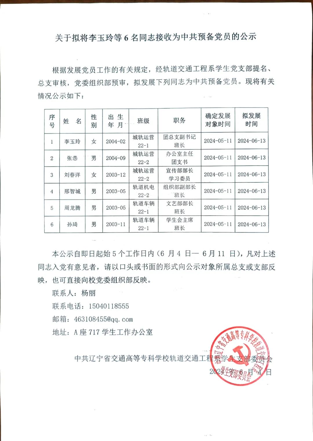 根据发展党员工作的有关规定,经轨道交通工程系学生党支部提名、总支审核,党委组织部预审,拟发展下列同志为中共预备党员。现将有关情况公示如下: