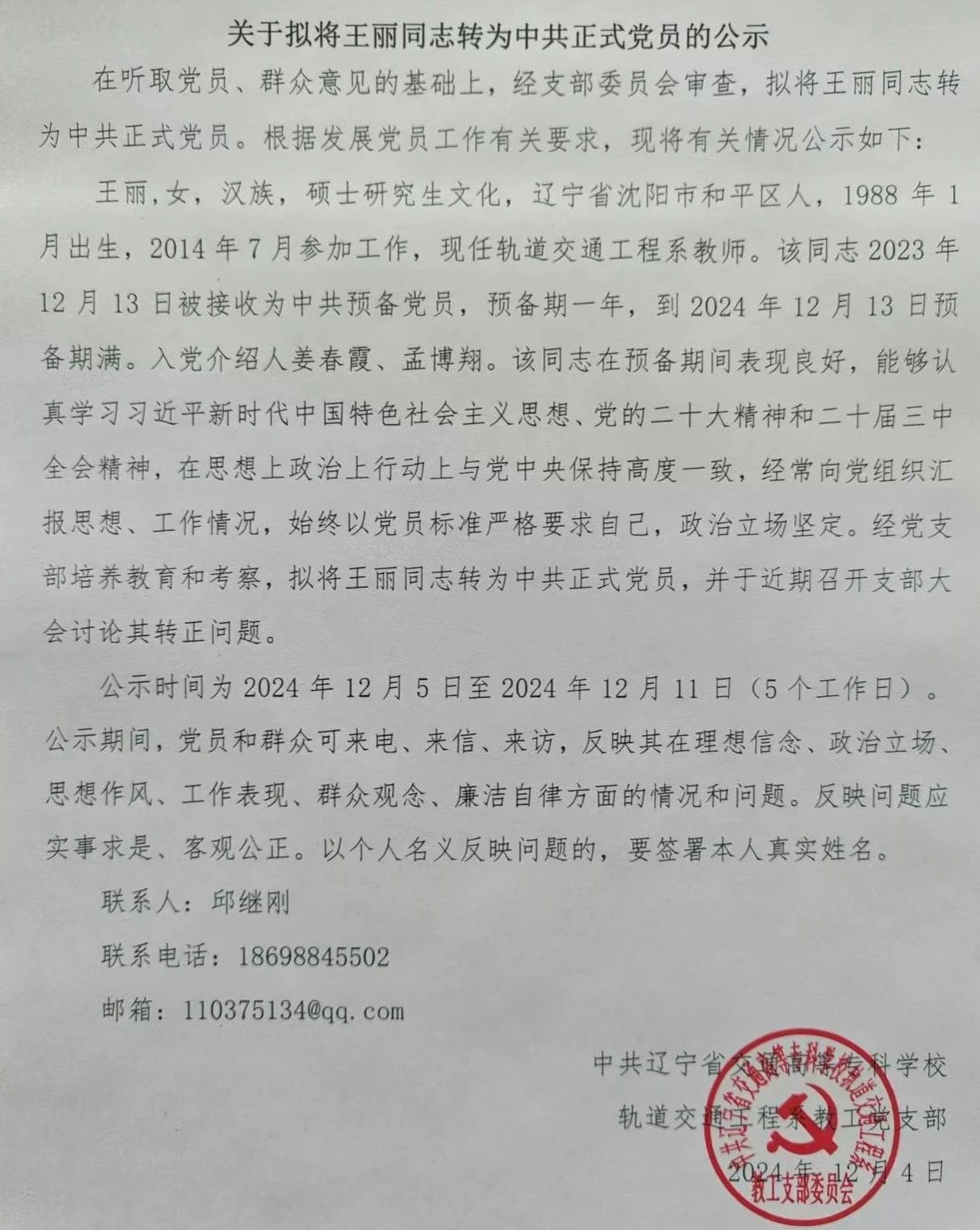 在听取党员、群众意见的基础上,经支部委员会审查,拟将王丽同志转为中共正式党员。根据发展党员工作有关要求,现将有关情况公示如下: