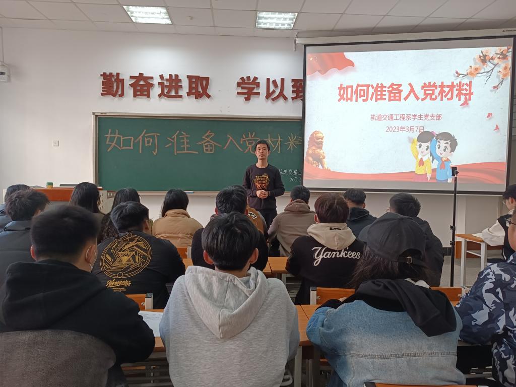 轨道交通工程系于2023年3月7日下午在C104举办了主题为“如何准备入党材料(一)”的专题党课。本次党课由轨道交通工程系专职组织员孔繁军主讲,2021级全体入党积极分子、2022级已经递交和准备递交《入党申请书》的同学参加。