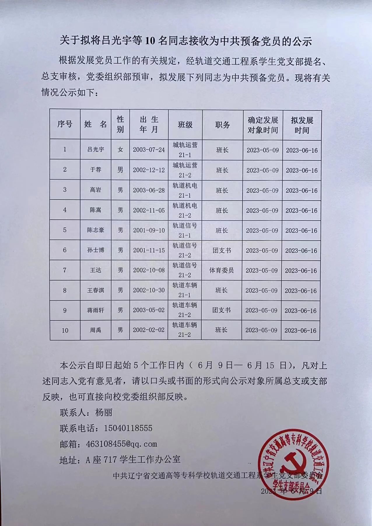 根据发展党员工作的有关规定,经轨道交通工程系学生党支部提名、总支审核,党委组织部预审,拟发展下列同志为中共预备党员。现将有关情况公示如下: