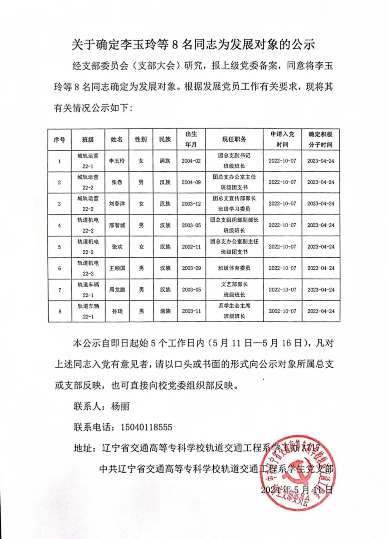 经支部委员会(支部大会)研究,报上级党委备案,同意将李玉玲等8名同志确定为发展对象。根据发展党员工作有关要求,现将其有关情况公示如下: