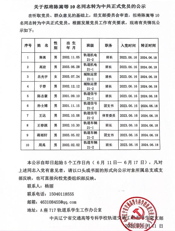 在听取党员、群众意见的基础上,经支部委员会审查,拟将陈等10名同志转为中共正式党员。根据发展党员工作有关要求,现将有关情况公示如下: