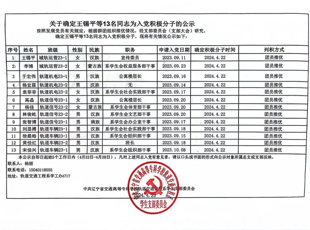 按照发展党员有关规定,根据群团组织推优情况,经支部委员会(支部大会)研究,确定王锡平等13名同志为入党积极分子,现将有关情况公示如下: