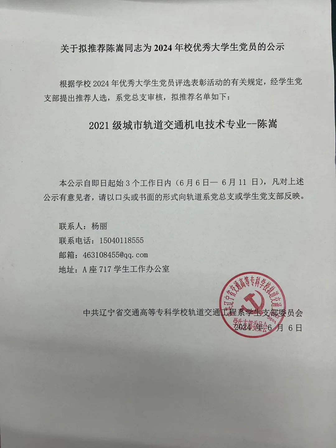 根据学校2024年优秀大学生党员评选表彰活动的有关规定,经学生党支部提出推荐人选,系党总支审核,拟推荐名单如下: