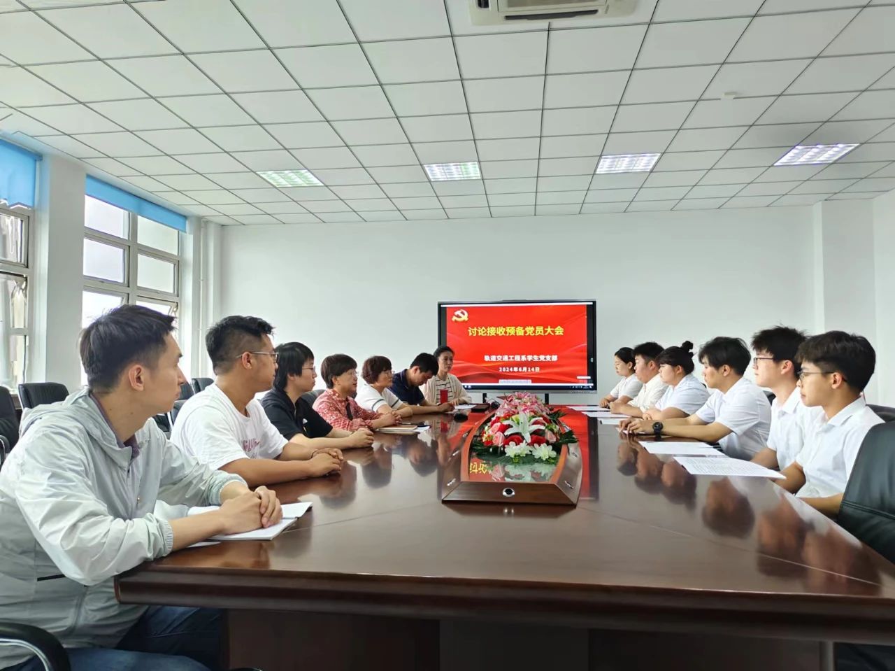 2024年6月14日,轨道交通工程系学生党支部于A座712会议室召开讨论接收预备党员大会。参与本次会议的有党总支书记慕威、党总支副书记边境、支部教师党员、组织员、发展对象介绍人和拟接收6名发展对象参加,会议由学生党支部书记杨丽老师主持。