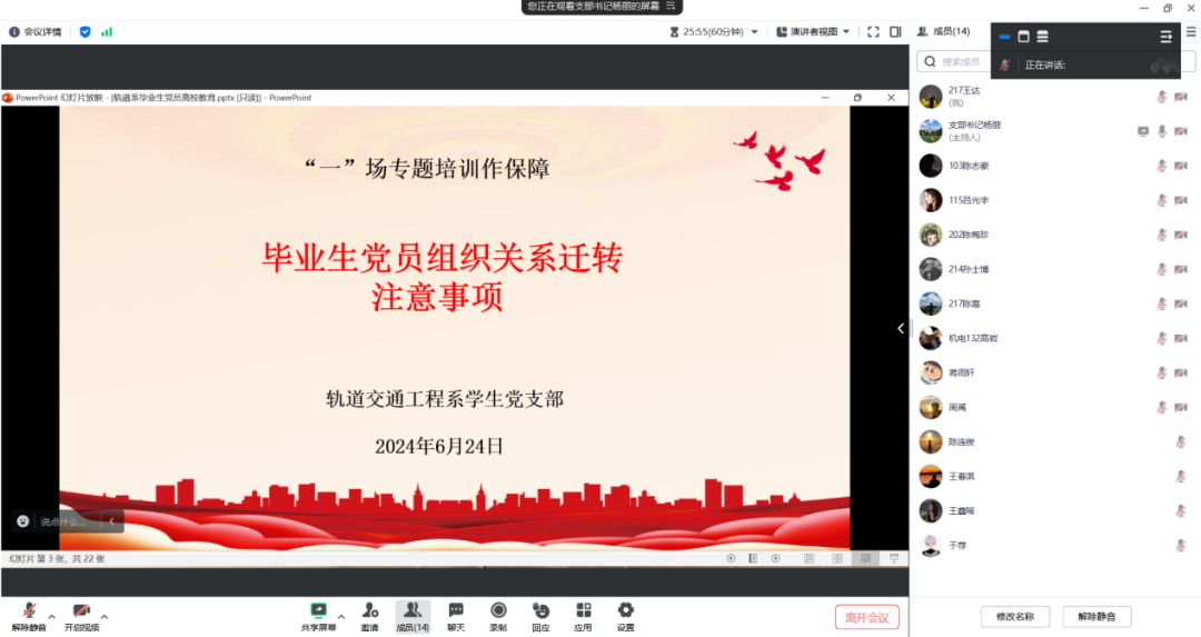 杨丽老师强调,党员组织关系转接是毕业生党员离校前至关重要的一项工作,希望全体党员能够理顺转接思路、明确时间节点。接着,针对“毕业生党员组织关系转移工作具体程序及注意事项”展开了详细介绍。
