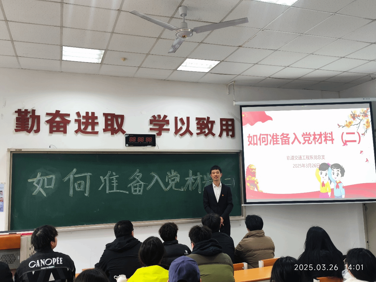 2025年3月26日14:00,轨道交通工程系于C座103教室开展题目为“如何准备入党材料(二)”的主题党课,此次党课由轨道系专职组织员孔繁军老师主讲,67、68期入党积极分子参加。