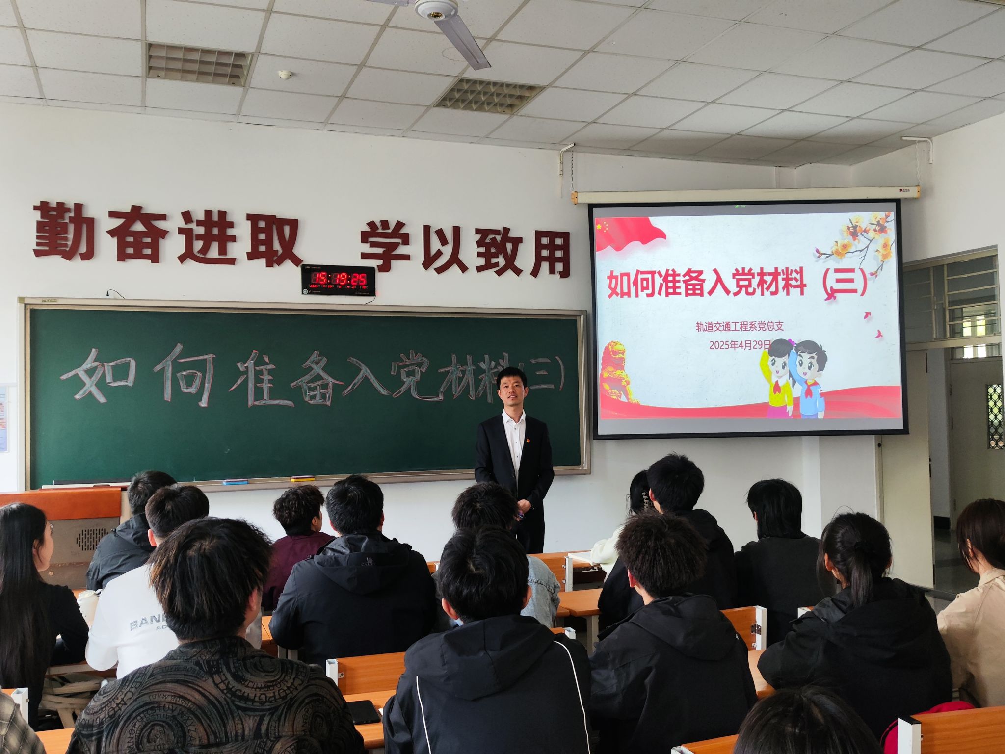 轨道交通工程系于2025年4月29日15:15在C105举办了主题为“如何准备入党材料(三)”的专题党课。本次党课由轨道交通工程系专职组织员孔繁军主讲,2024级全体入党积极分子参加。