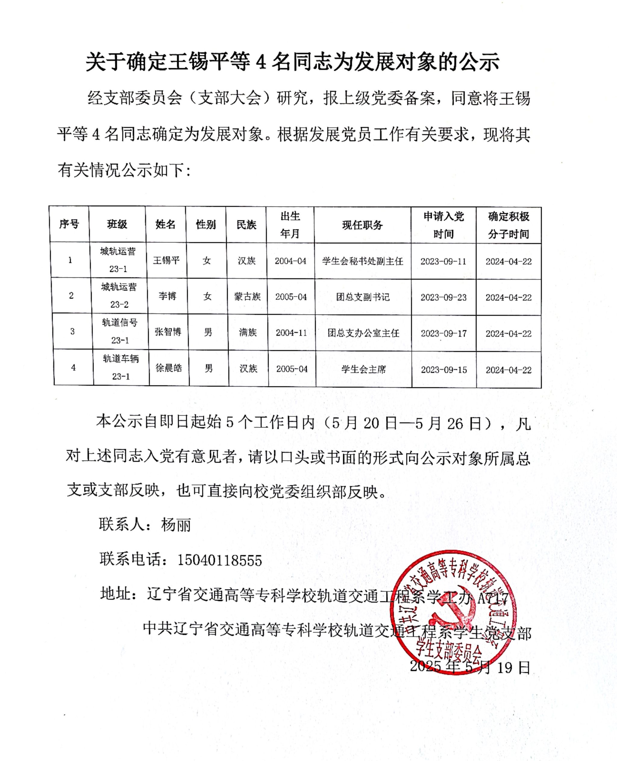 经支部委员会(支部大会)研究,报上级党委备案,同意将王锡平等4名同志确定为发展对象。根据发展党员工作有关要求。现将其有关情况公示如下: