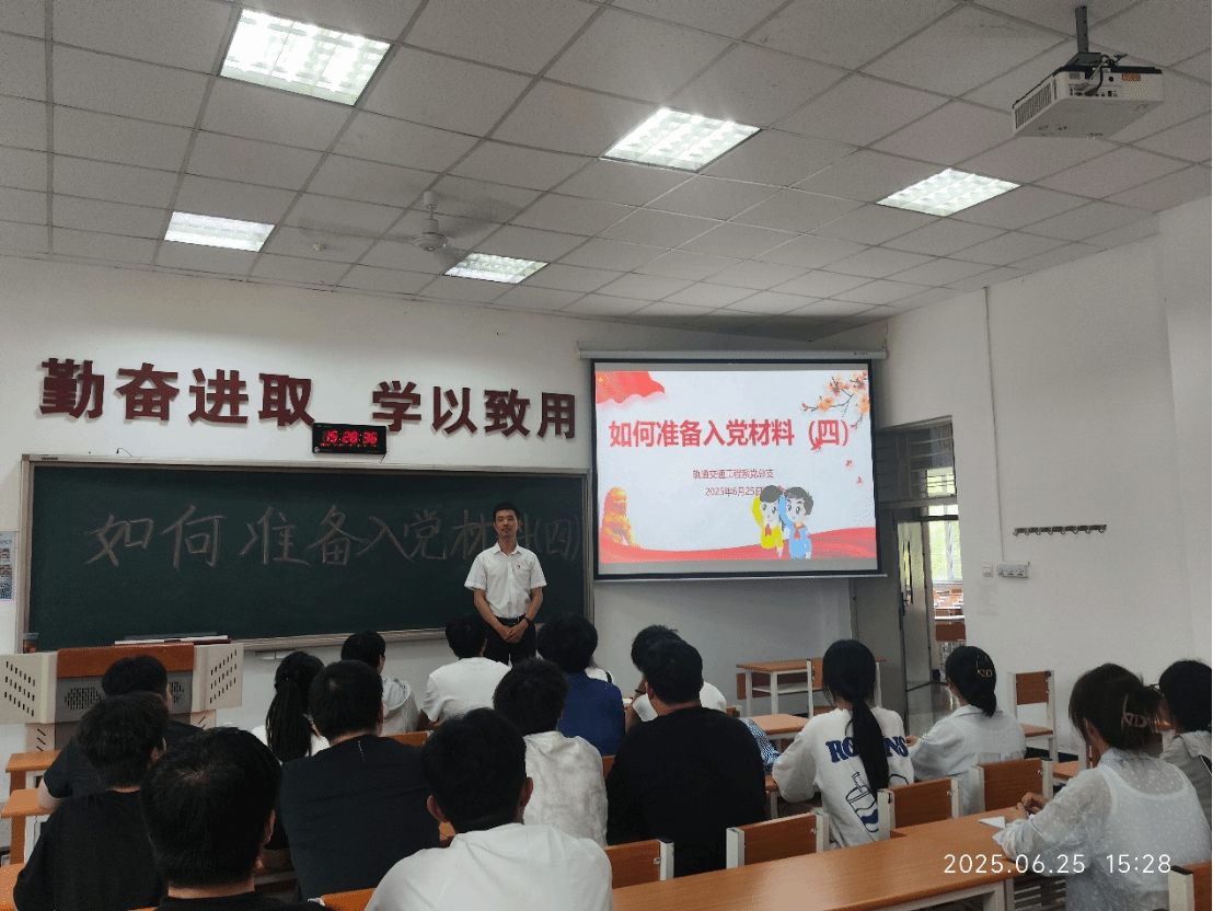 轨道交通工程系于2025年6月25日在C102举办了主题为“如何准备入党材料(四)”的专题党课。本次党课由轨道交通工程系专职组织员孔繁军主讲,轨道系67、68期入党积极分子参加。