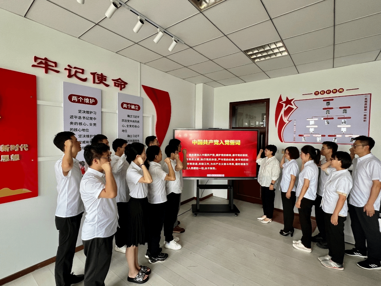 接着,全体党员重温入党誓词,党员们神情肃穆,整齐列队,高举右拳,以铿锵有力的声音庄严宣誓:“我志愿加入中国共产党,拥护党的纲领,遵守党的章程……”掷地有声的誓言久久回荡,字字千钧、句句赤诚,不仅是对入党初心的回溯,更是对共产主义事业奋斗终身的庄严承诺,彰显着党员们对党的无限忠诚与热爱。
