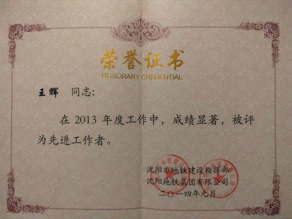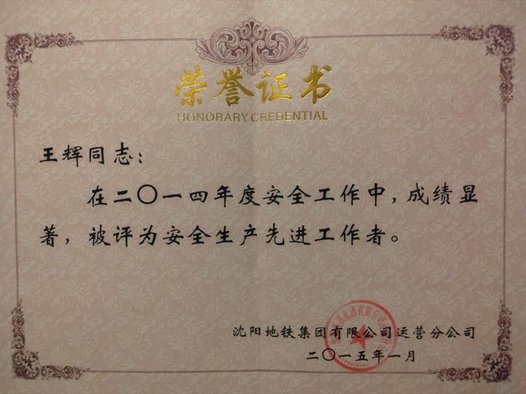 2015年度沈阳地铁集团有限公运营分公司先进工作者。