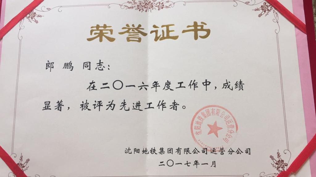 2016年度沈阳地铁集团有限公运营分公司优秀员工。
