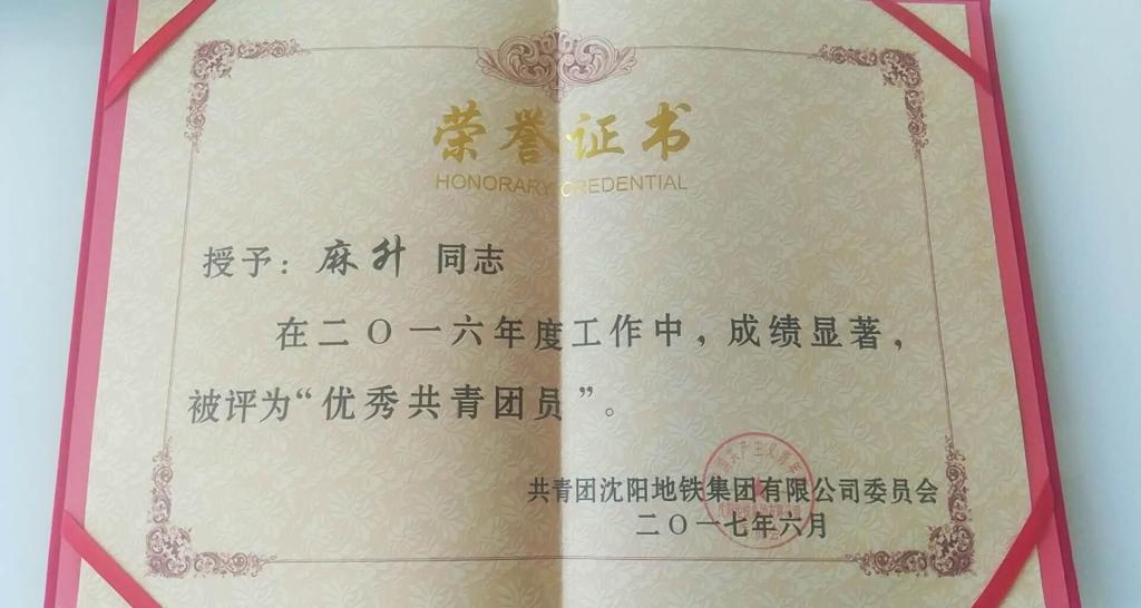 2016年度沈阳地铁集团有限公运营分公司优秀共青团员。