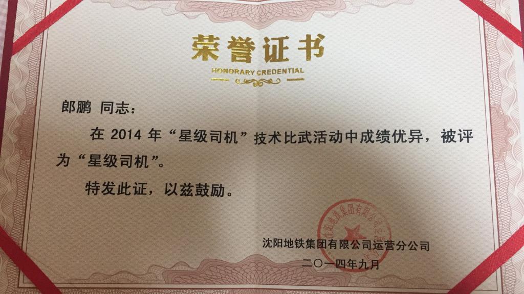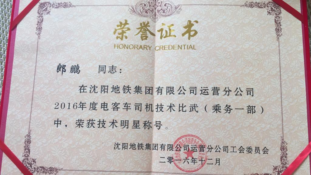 2016年度沈阳地铁集团有限公运营分公司星级司机。