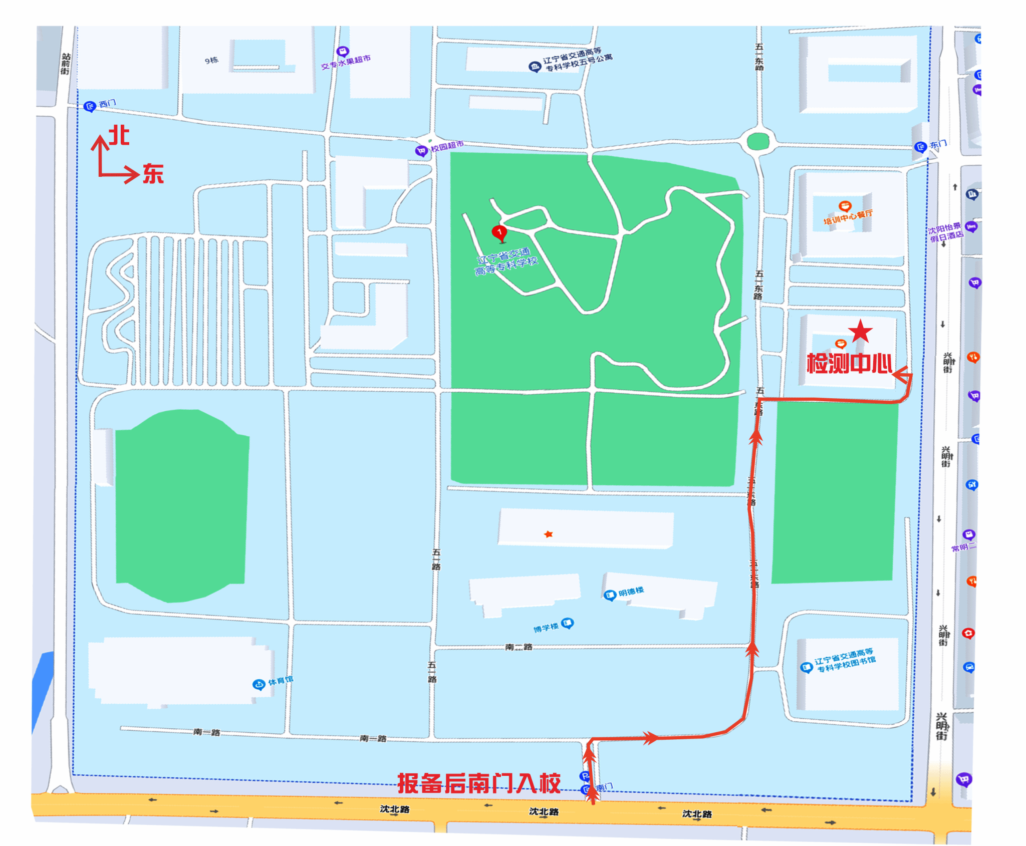 路线图:报备后统一由南门入校