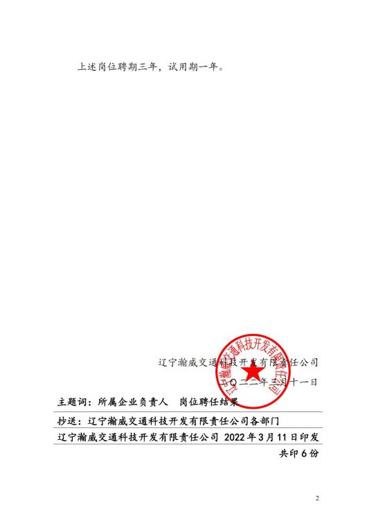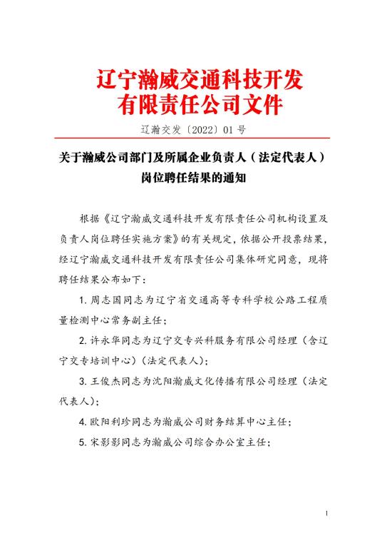 关于瀚威公司部门及所属企业负责人(法定代表人) 岗位聘任结果的通知(辽瀚交发【2022】01号)