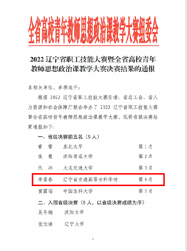 受省内疫情的影响,2022年辽宁省职工技能大赛决赛赛程有所延迟,一直延迟至12月13日,两位晋级决赛的选手在有限的时间里积极备赛、认真练习、克服各种困难,代表学校最终取得了优异的成绩。新的一年,学校将以本次全省高校青年教师教学竞赛为契机,坚定不移落实立德树人根本任务,坚持不懈用习近平新时代中国特色社会主义思想铸魂育人。搭建好以赛促教、以赛促改、以赛促建的平台,不断提升我校教师尤其是青年教师的教学能力,增进学校教学团队整体的核心凝聚力,不忘初心,砥砺前行,为我校“双高”建设增光添彩!