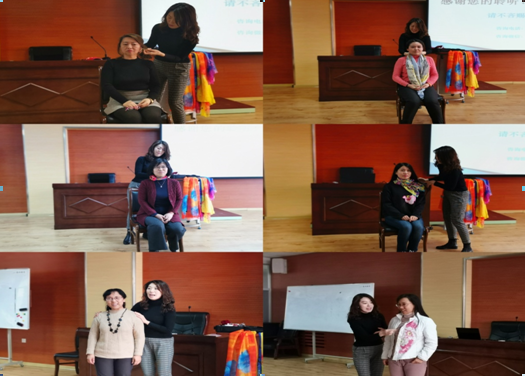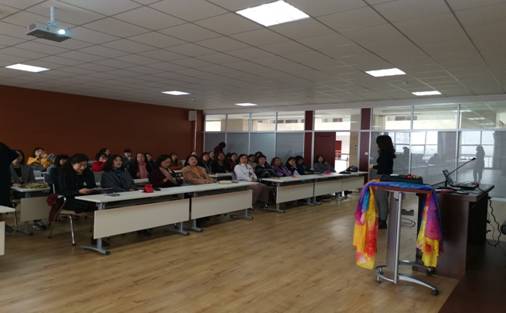 杨帆老师的讲座主要从日妆画法及化妆步骤、常用服装的配色及穿搭、丝巾的系法及小配饰的使用方法等几部分展开。讲座现场气氛温馨,杨老师用生动的语言深入浅出地讲解,使教师们认识到合适的妆容可以提升教师的气质和自信,合理搭配穿着能让教师的品味得到提升。