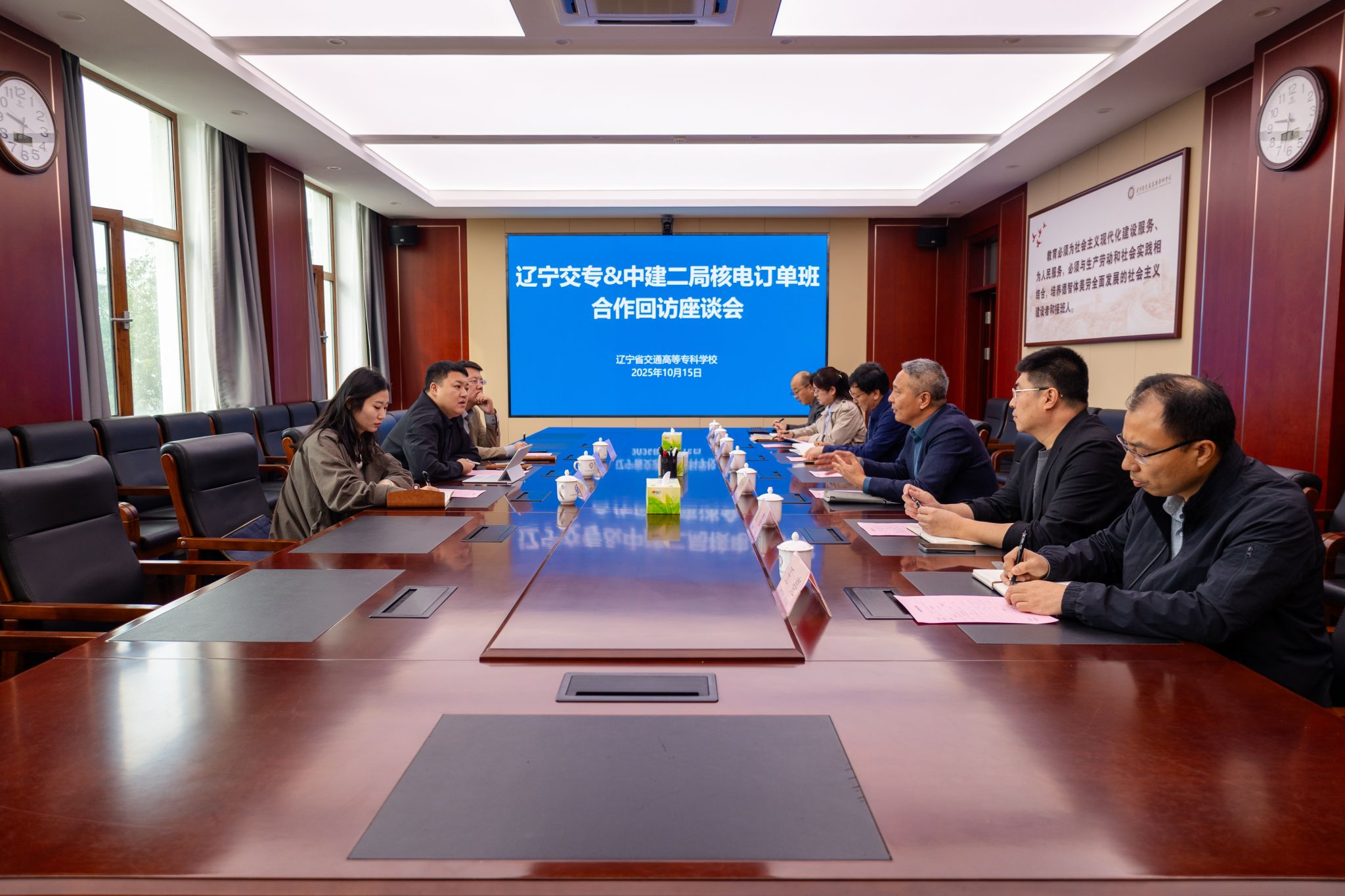 为深入贯彻学校“破局就业痛点校准培养方向校企同频共振——助推毕业生高质量就业”专项大讨论工作精神,推动校企合作走深走实,10月15日,中建二局核电分公司核电项目管理中心综合管理分部经理龚佳文、太平岭核电项目副书记冷文鹏、徐大堡核电项目人力负责人杜蕊一行莅临我校,就校企合作订单班相关事宜开展回访座谈,并面向2024级学生举行订单班学员招聘。此次活动旨在通过校企协同联动,精准对接岗位需求,共育核电建设高素质技术技能人才。副校长张洪革、低空技术与工程系、公路与铁道工程系、建筑工程系等相关部门负责人共同参与座谈交流。
