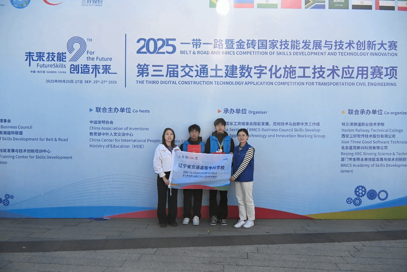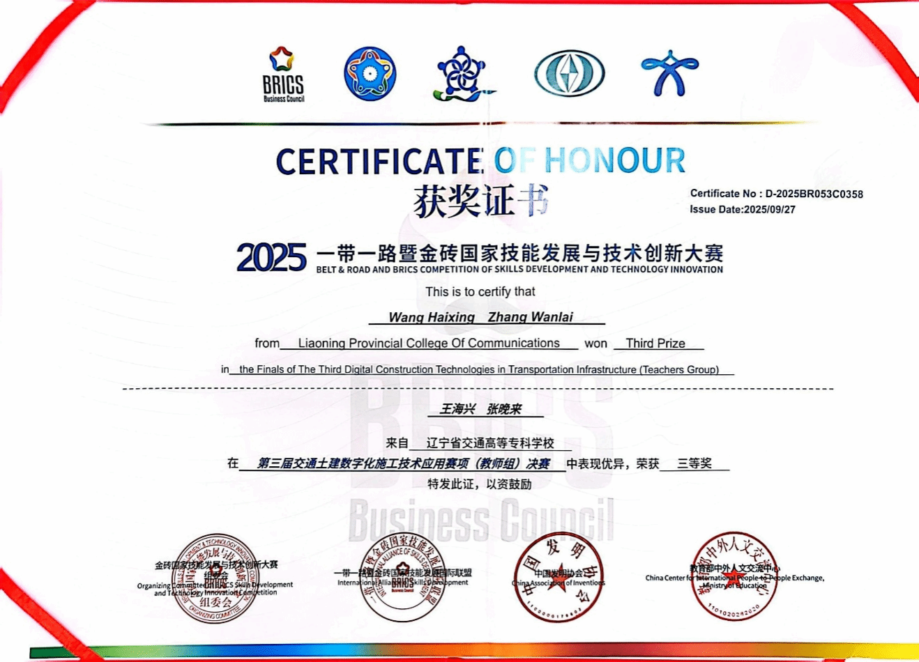 2025年9月25日至27日,2025“一带一路”暨金砖国家技能发展与技术创新大赛之第三届交通土建数字化施工技术应用赛项决赛在哈尔滨铁道职业技术学院隆重召开。作为经金砖国家工商理事会批准、外交部备案的国际赛事核心赛项,本次决赛规模盛大、覆盖面广,吸引了来自全国30个省级行政区的141所院校参与,共253支学生队伍与28支教师队伍参与总决赛。本次竞赛,我校公路与铁道工程系李琛琛和于珂卿两名同学,在于可鑫和曹英浩两位教师的悉心指导下,获得了本次大赛的国赛学生组“三等奖”;我校公路与铁道工程系王海兴和张晚来两位老师获得了国赛教师组“三等奖”。