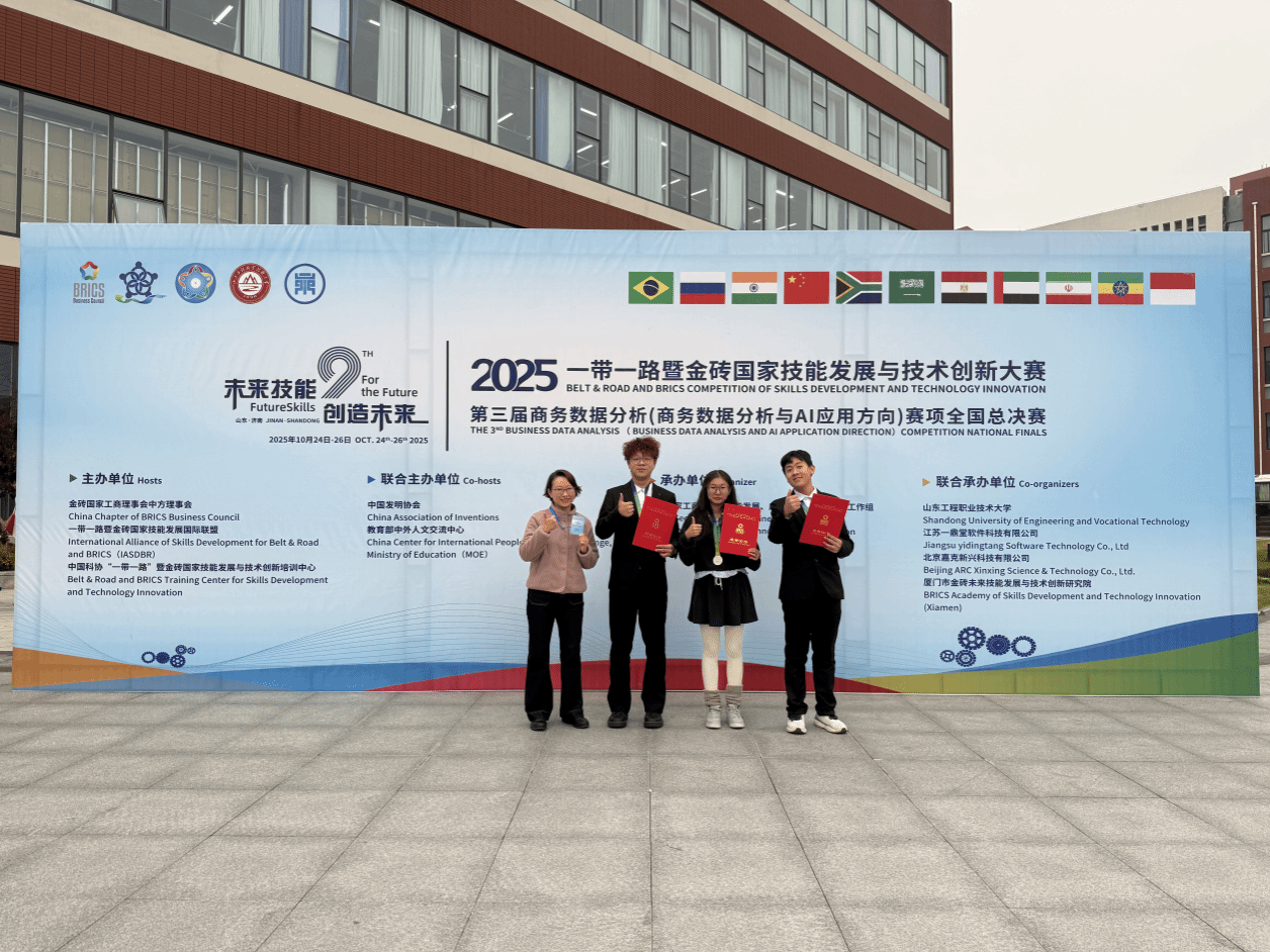 近日,2025一带一路暨金砖国家技能发展与技术创新大赛之第三届商务数据分析(商务数据分析与AI应用方向)赛项全国总决赛(高职组)圆满落幕。我校物流管理系组建的参赛团队,在全国百余支强劲队伍的激烈角逐中脱颖而出,最终斩获全国总决赛二等奖,王溪倩、张冰华两位老师获评“优秀指导教师”,学校获评“优秀组织奖”,用实力书写了职业教育育人成效的亮眼答卷。