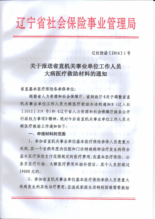 根据省人社厅、省财政厅《关于调整省直机关事业单位工作人员大病医疗救助办法的通知》(辽人社【2012】319号)和《辽宁省人力资源和社会保障厅政务公开行政权力事项》精神,省社保局将开展2016年度省直机关事业单位工作人员大病医疗救助工作。具体申报范围、申报材料和相关要求详见文件。因本次工作申报时间短暂,相关人员请于1月5日前将申报材料准备齐全,与人力资源处具体工作人员取得联系。
