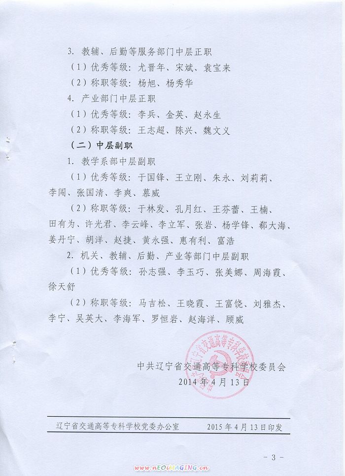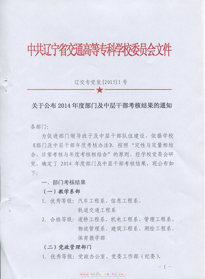 关于公布2014年度部门及中层干部考核结果的通知(辽交专党发[2015]1号)