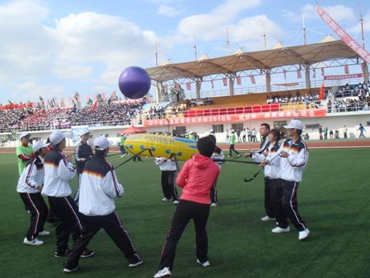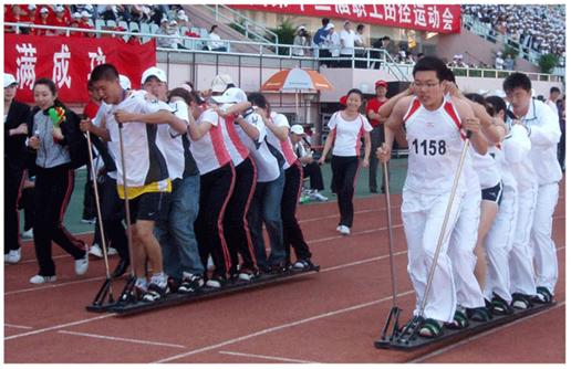 【比赛方法】比赛开始前,比赛器材置于起跑线后。1名男队员站在动感五环内,2名女队员在两侧掌控方向。赛程70米。裁判发令后,3名队员通过协作配合使比赛器材在跑道上行进,以比赛器材任一部位触及终点线所在垂直平面为计时停止,用时少者名次列前。