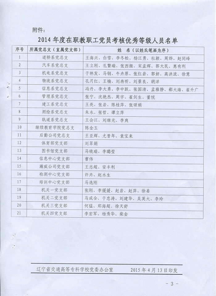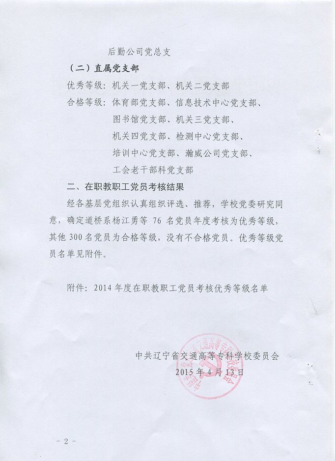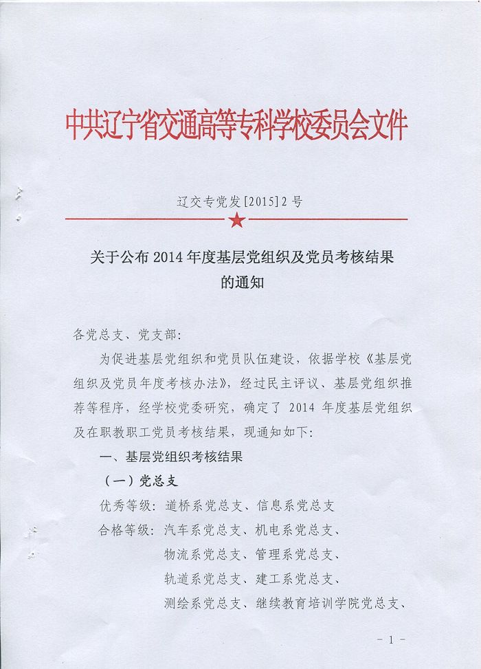 关于公布2014年度基层党组织及党员考核结果的通知(辽交专党发[2015]2号)