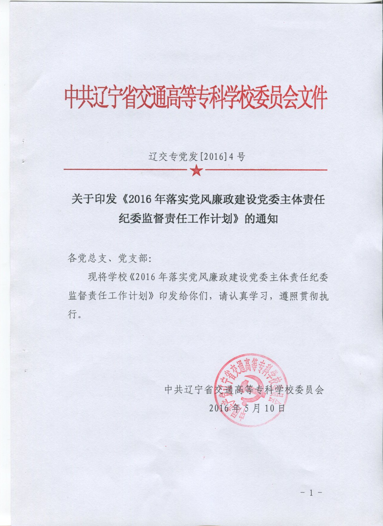 关于印发《2016年落实党风廉政建设党委主体责任纪委监督责任工作计划》的通知