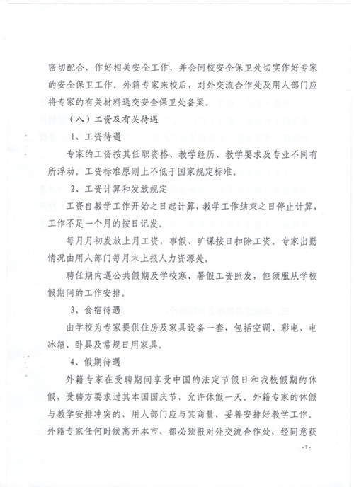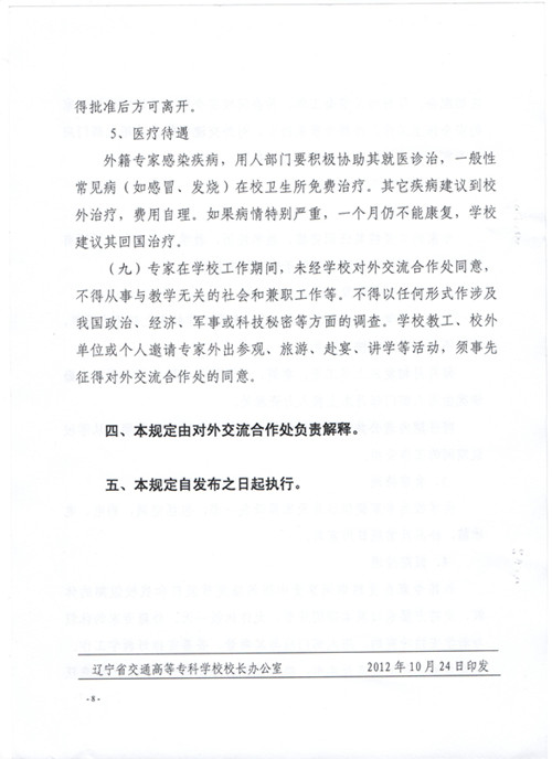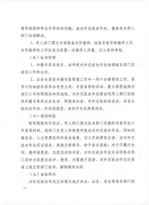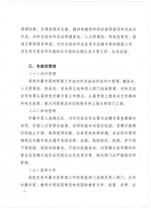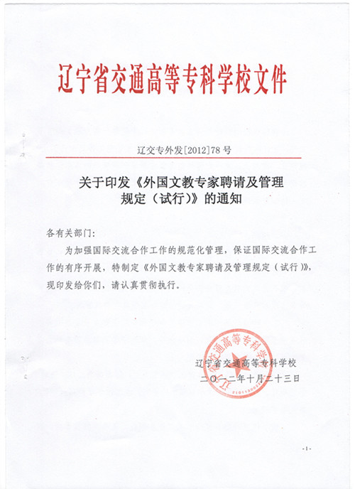 为加强国际交流合作工作的规范化管理,积极开展外国智力资源和先进技术的引进工作,提升学校的国际影响和教育教学质量,特制定《m体育(中国)有限公司官网外国文教专家聘请及管理规定(试行)》(辽交专外发[2012]78号)规定,请认真贯彻执行。