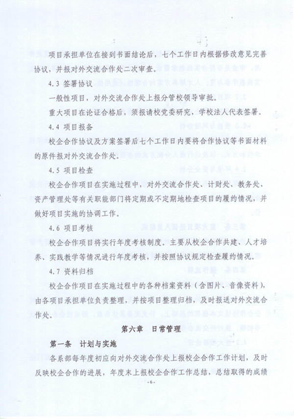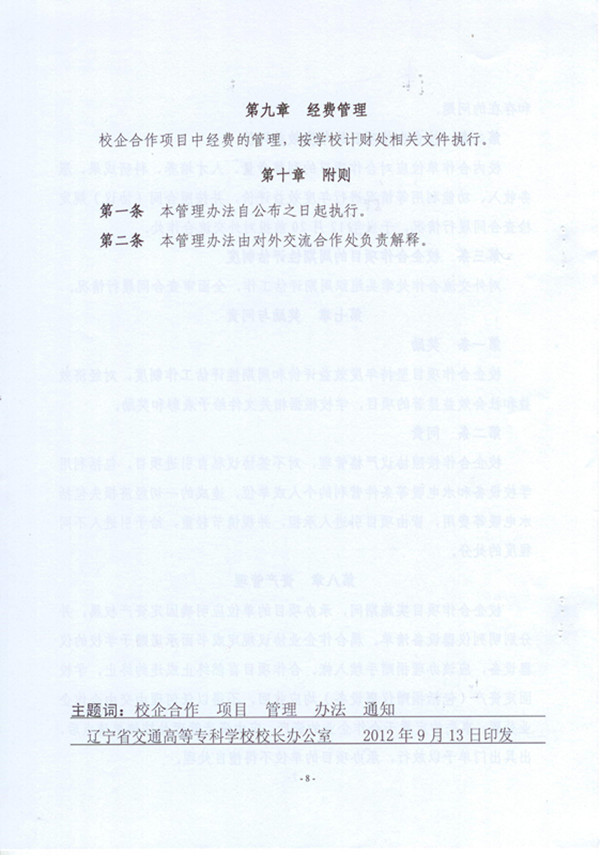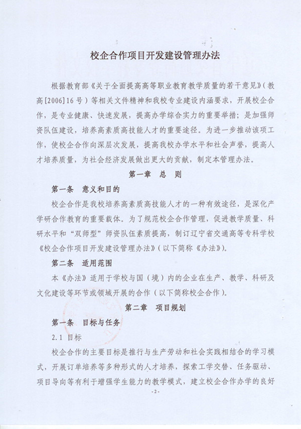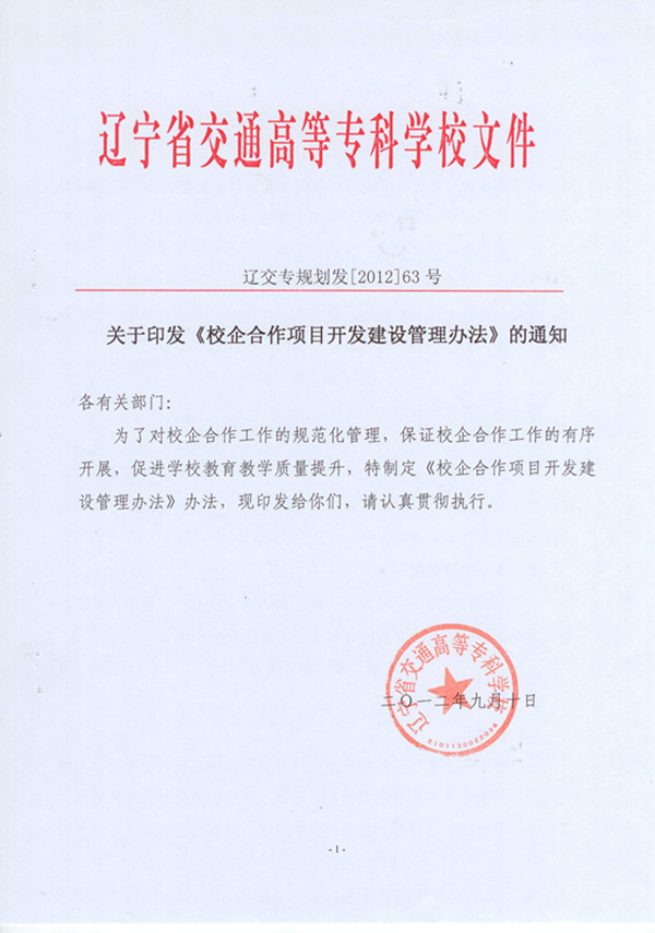为了对校企合作工作的规范化管理,保证校企合作工作的有序开展,促进学校教育教学质量提升,特制定《校企合作项目开发建设管理办法》(辽交专规划发【2012】63号),请贯彻执行。