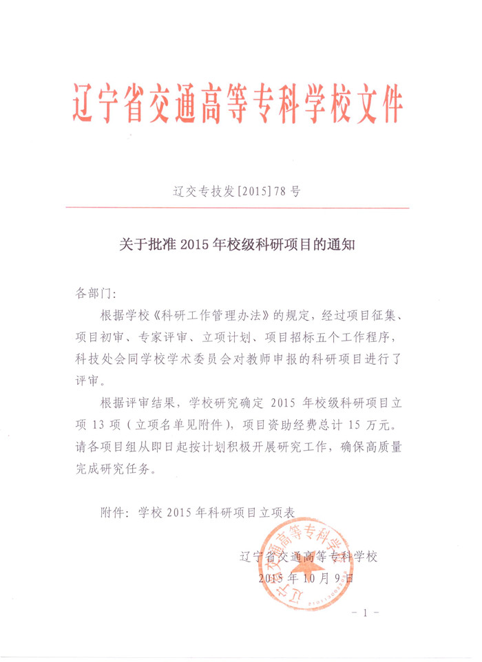 学校已发布《关于批准2015年校级科研项目的通知》(辽交专技发〔2015〕78号),请项目负责人认真编写项目计划任务书,校级科研项目计划任务书在“科技处网站—资料下载”中下载,于10月16日前将填好的项目计划任务书电子文档以“校级科研计划任务书+姓名”发送到邮箱:lncckjc@163.com。请各项目组从即日起按计划积极开展研究工作,确保高质量完成研究任务。