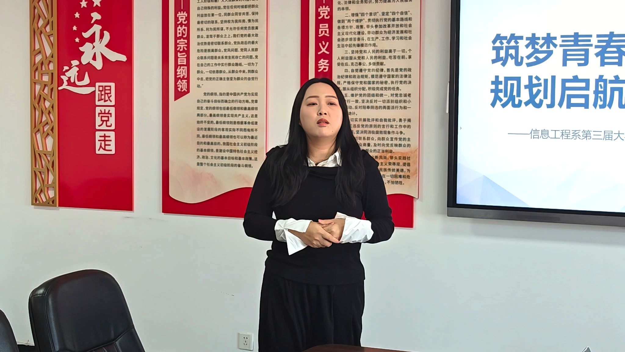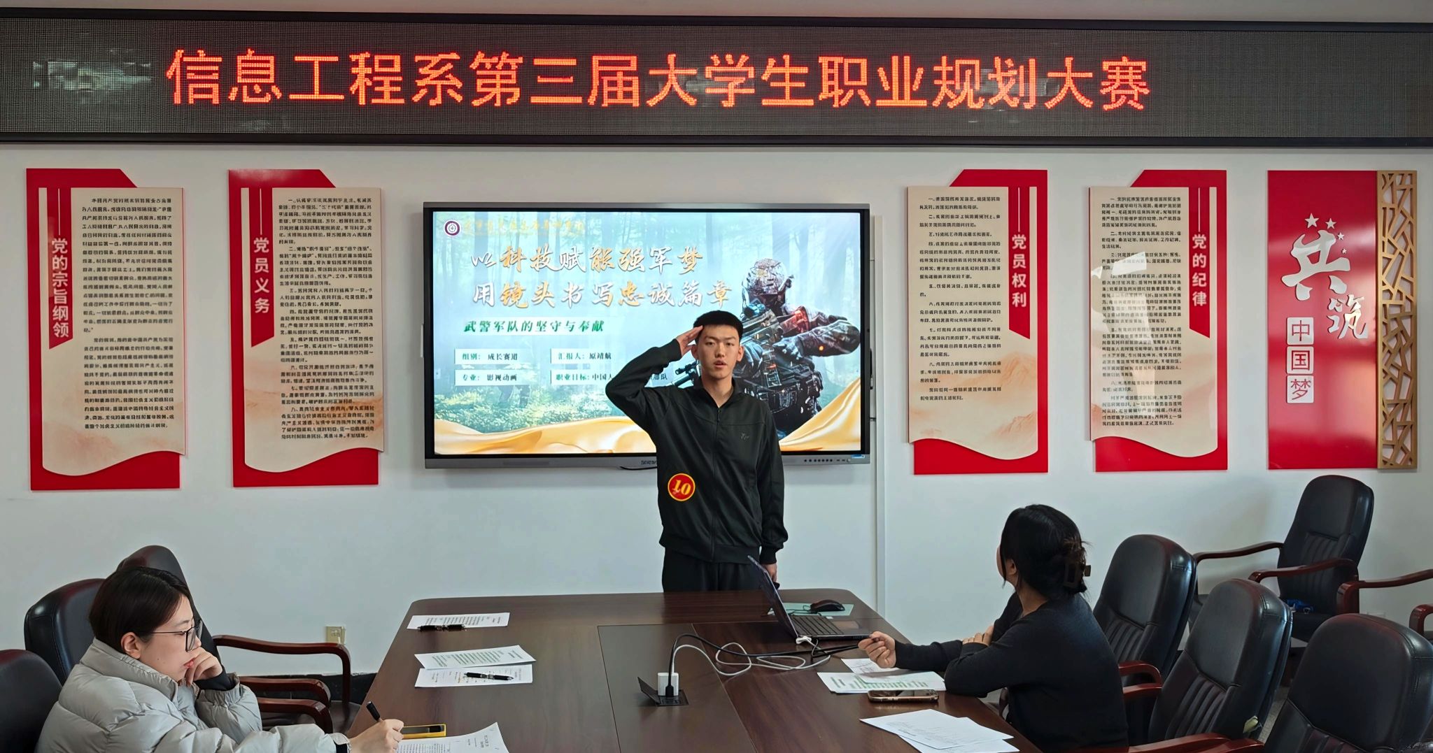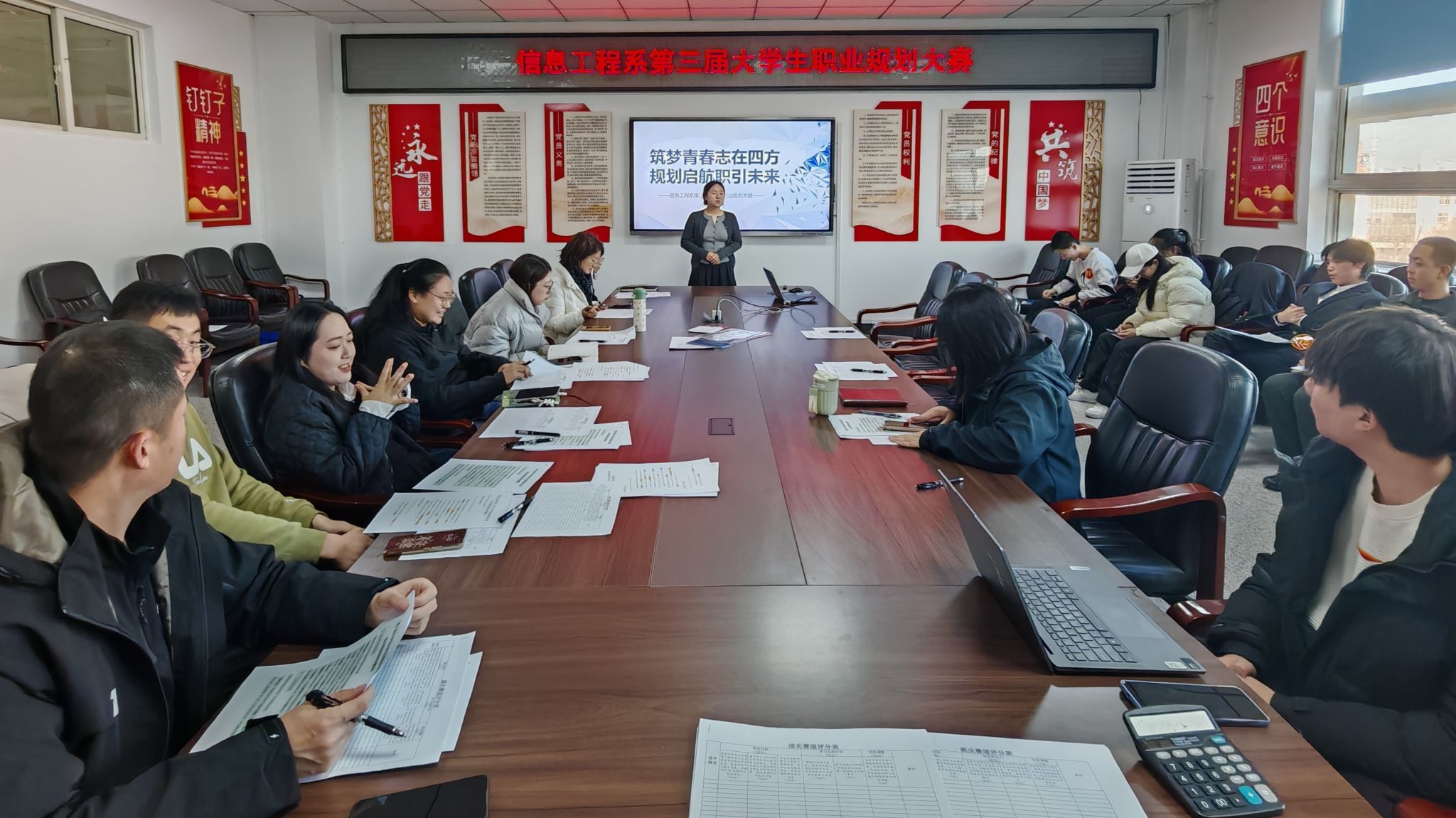 为深入贯彻落实国家关于高校毕业生就业工作的决策部署,引导大学生科学规划职业生涯,将个人理想追求主动融入国家发展和时代洪流,实现以赛促学、以赛促就的目标,信息工程系于11月13日在综合实训楼502会议室成功举办了以“筑梦青春志在四方,规划启航职引未来”为主题的第三届大学生职业规划大赛。大赛由刘新老师主持,信息工程系党总支书记王喜华、全体辅导员及初赛入围选手参与。