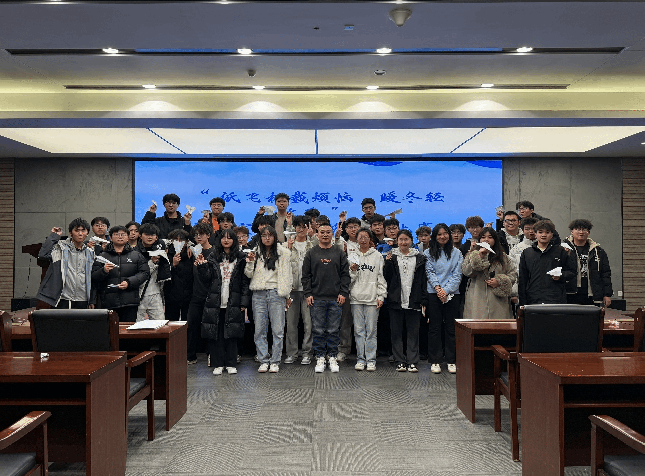 活动旨在帮助同学们释放压力、调节情绪,在轻松愉悦的氛围中迎接冬日。王旭东表示,“纸飞机象征着我们对烦恼的释放和对美好的期盼,希望同学们能在这个夜晚,真正放下心中的负担,轻装前行。”在老师的暖心寄语后,同学们在纸张中认真写下自己的心事与愿望。有的同学将学业压力、生活困惑悄悄倾注于笔端,有的则在纸飞机上绘制笑脸、星星等图案,寄托对未来的美好期待。