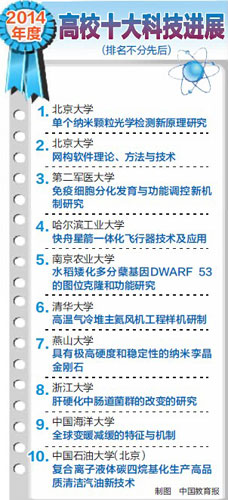 本报北京12月23日讯,由教育部科学技术委员会组织评选的2014年度“中国高等学校十大科技进展”,日前在京揭晓。经过形式审查、学部初评、主任办公(扩大)会终评和项目公示,北京大学主持的单个纳米颗粒光学检测新原理研究等10个高校科技项目,获评本年度高校科技十大进展。