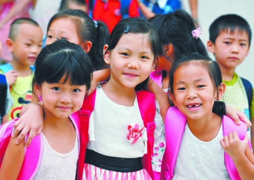 来自四川省渠县的外来工子女胡嘉仪(中)和同学走出校园。通过电脑公开派位,胡嘉仪在家附近的福建省福州市晋安区西园中心小学顺利入学。(资料图片)