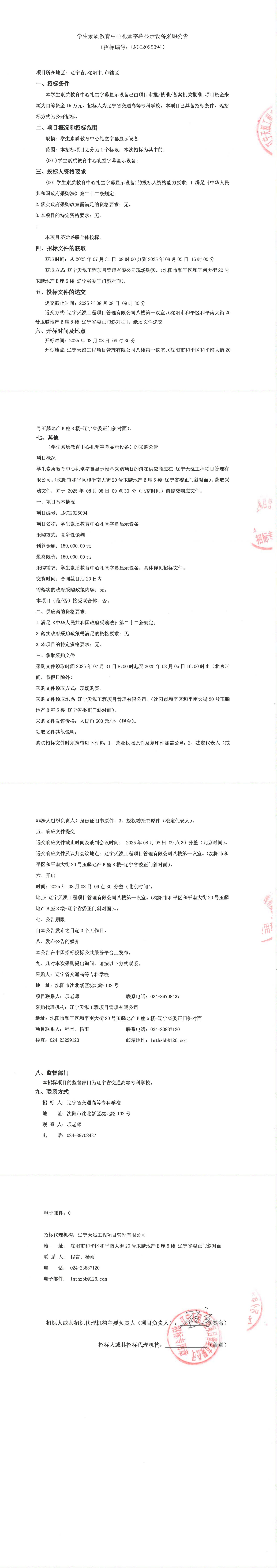 学生素质教育中心礼堂字幕显示设备采购公告(LNCC2025094)