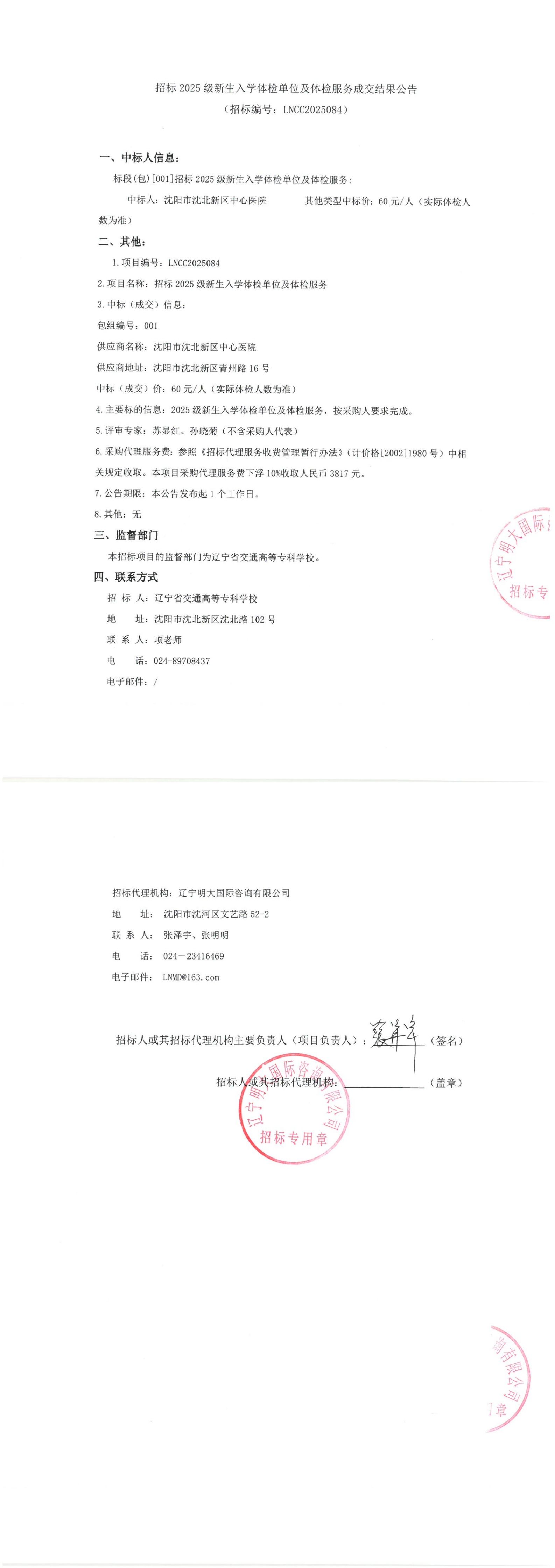 招标 2025 级新生入学体检单位及体检服务成交结果公告