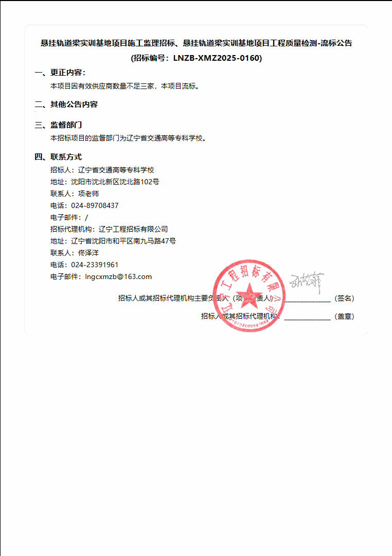 悬挂轨道梁实训基地项目施工监理招标、悬挂轨道梁实训基地项目工程质量检测-流标公告