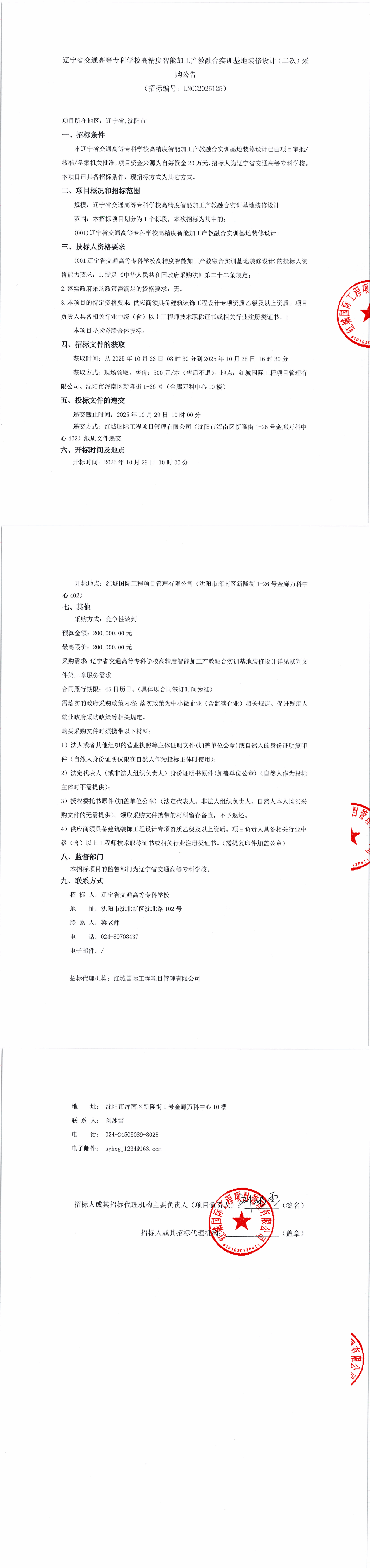 m体育(中国)有限公司官网高精度智能加工产教融合实训基地装修设计(二次)采购公告(LNCC2025125)