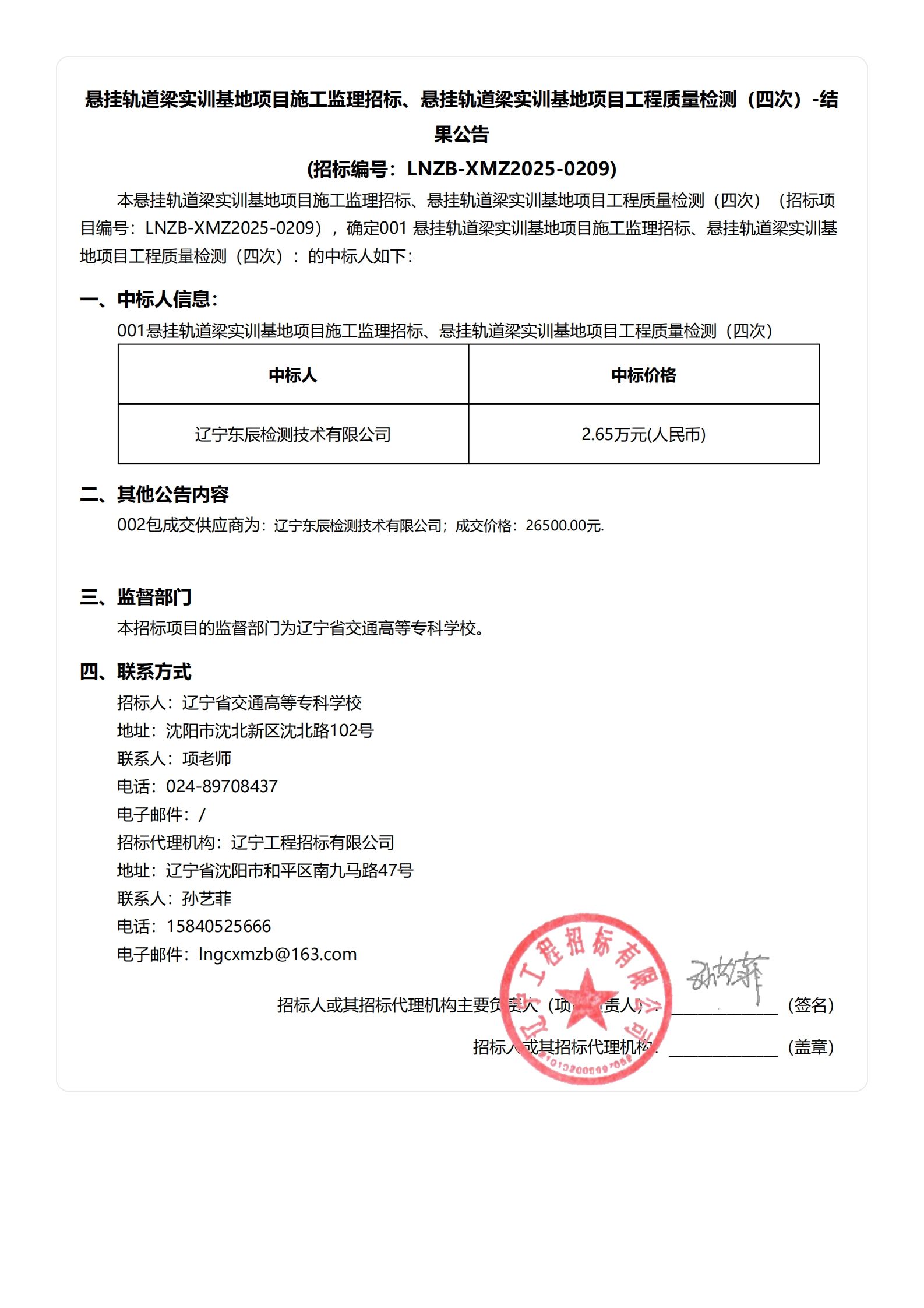 悬挂轨道梁实训基地项目施工监理招标、悬挂轨道梁实训基地项目工程质量检测(四次)结果公告